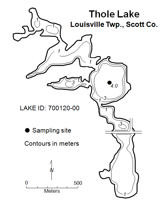 Thole Lake is located in Louisville Township. It covers approximately 119 acres and has a maximum depth of about 4 meters.